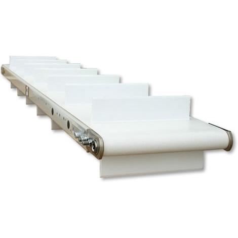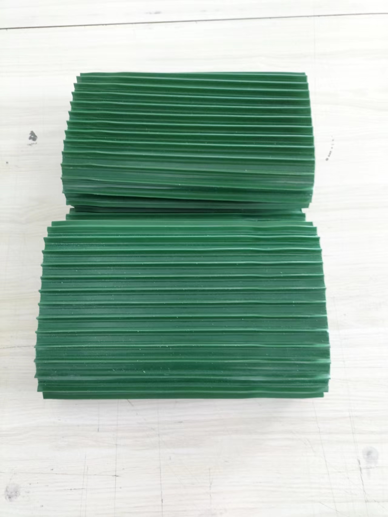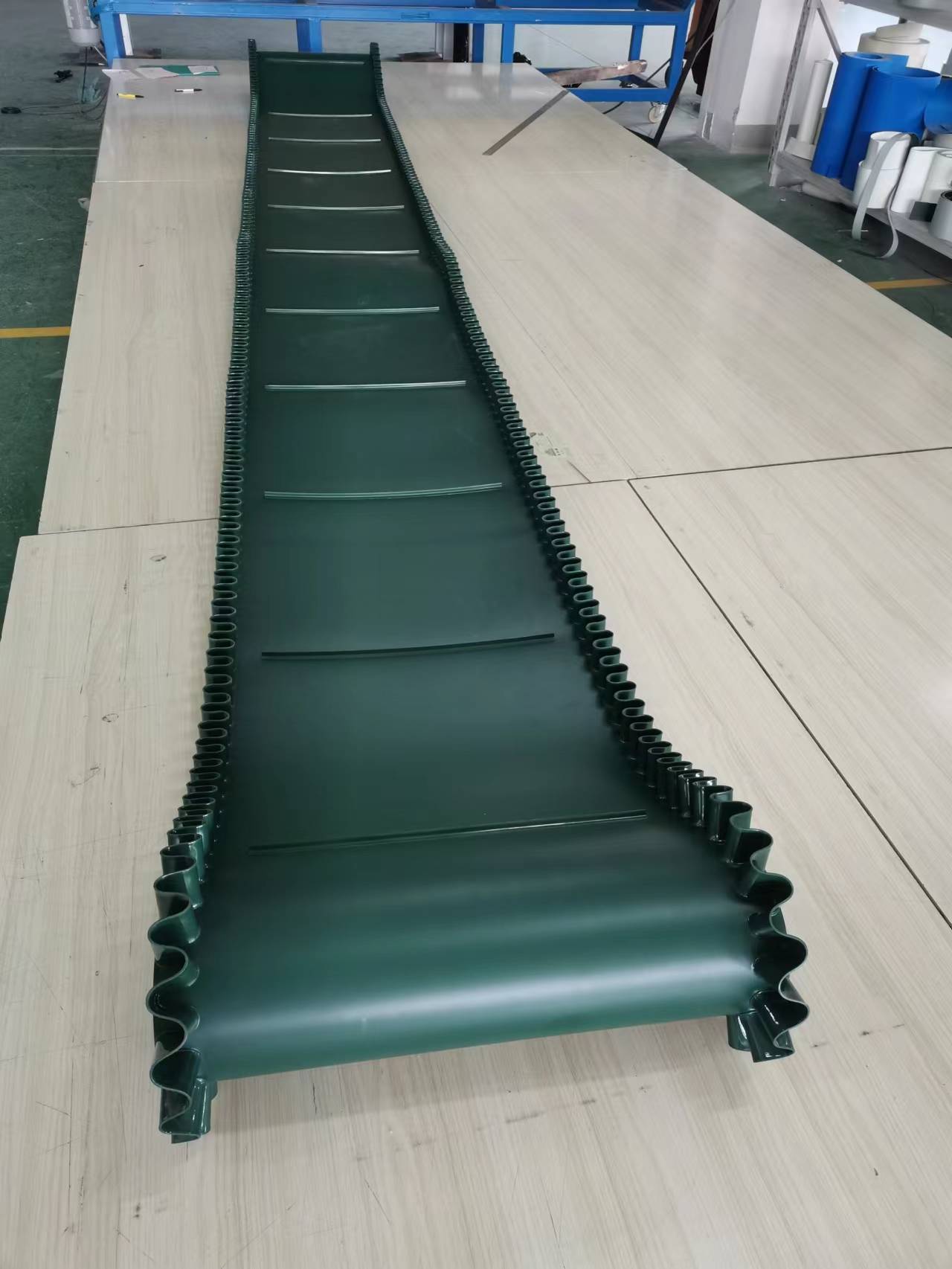 產品材料說明:擋板加工說明:輸送帶(裙邊擋板帶),擋邊起防止物料測滑撒落的作用。為便于轉彎,裙邊設計成波紋狀;橫隔板的作用是承托物料,為了實現大傾角輸送,采用T型TC型。檔邊和橫隔板是用二次硫化的方法與基帶連接的,具有很高的連接強度。用于輸送易散落的粉狀、粒狀、小塊狀、糊狀及液態狀物料。輸送帶材料:環保型材料:輸送帶的生產原材料,產品配方科學合理,符合食品衛生標準可與食品直接接觸,色澤適度,無異味