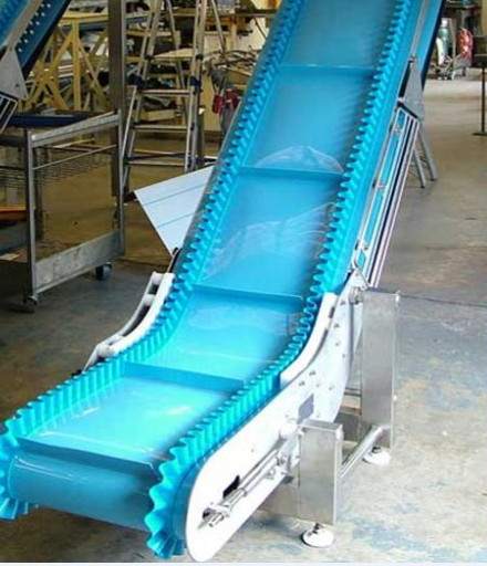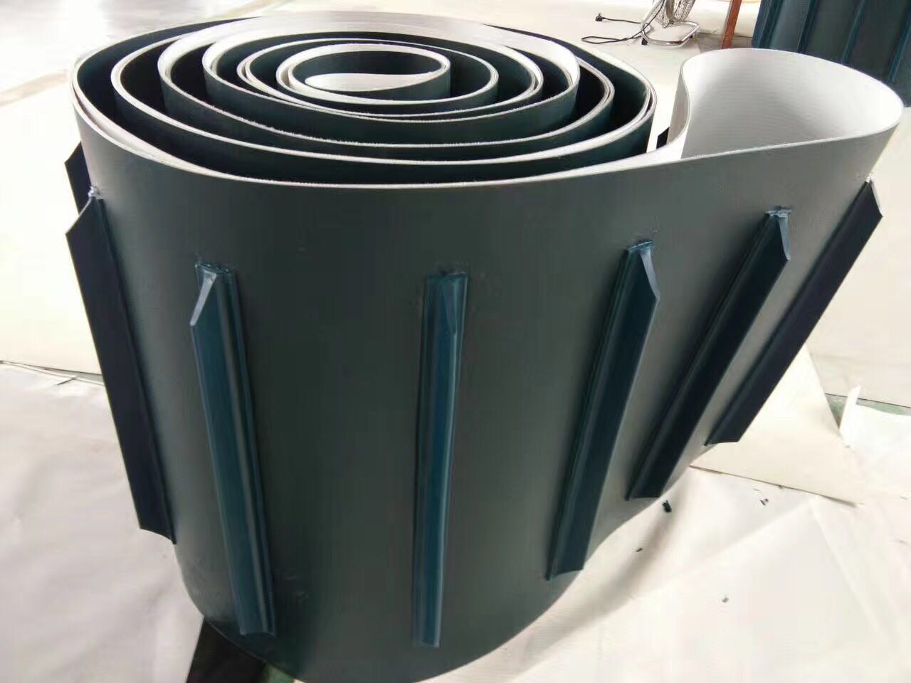 輸送帶(裙邊擋板帶),擋邊起防止物料測滑撒落的作用。為便于轉彎,裙邊設計成波紋狀;橫隔板的作用是承托物料,為了實現大傾角輸送,采用T型TC型。檔邊和橫隔板是用二次硫化的方法與基帶連接的,具有很高的連接強度。用于輸送易散落的粉狀、粒狀、小塊狀、糊狀及液態狀物料。