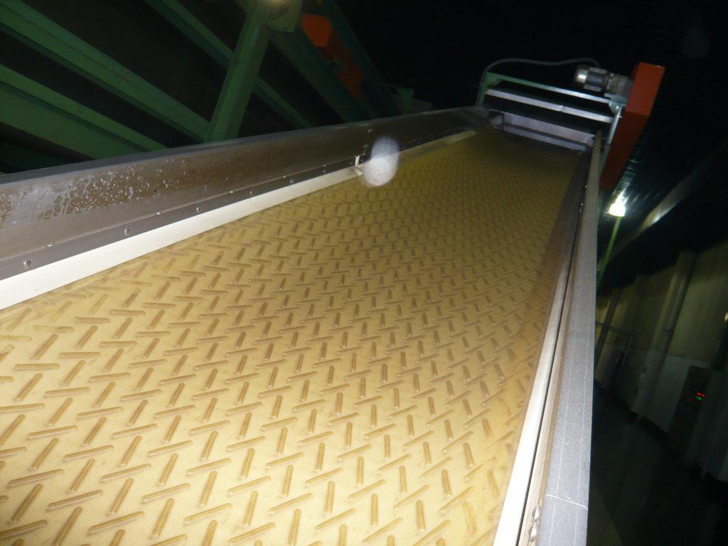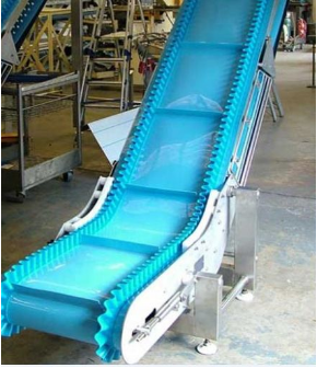 PU白色食品輸送帶(裙邊擋板帶),擋邊起防止物料測滑撒落的作用。為便于轉彎,裙邊設計成波紋狀;橫隔板的作用是承托物料,為了實現大傾角輸送,采用T型TC型。檔邊和橫隔板是用二次硫化的方法與基帶連接的,具有很高的連接強度。用于輸送易散落的粉狀、粒狀、小塊狀、糊狀及液態狀物料。