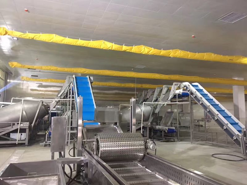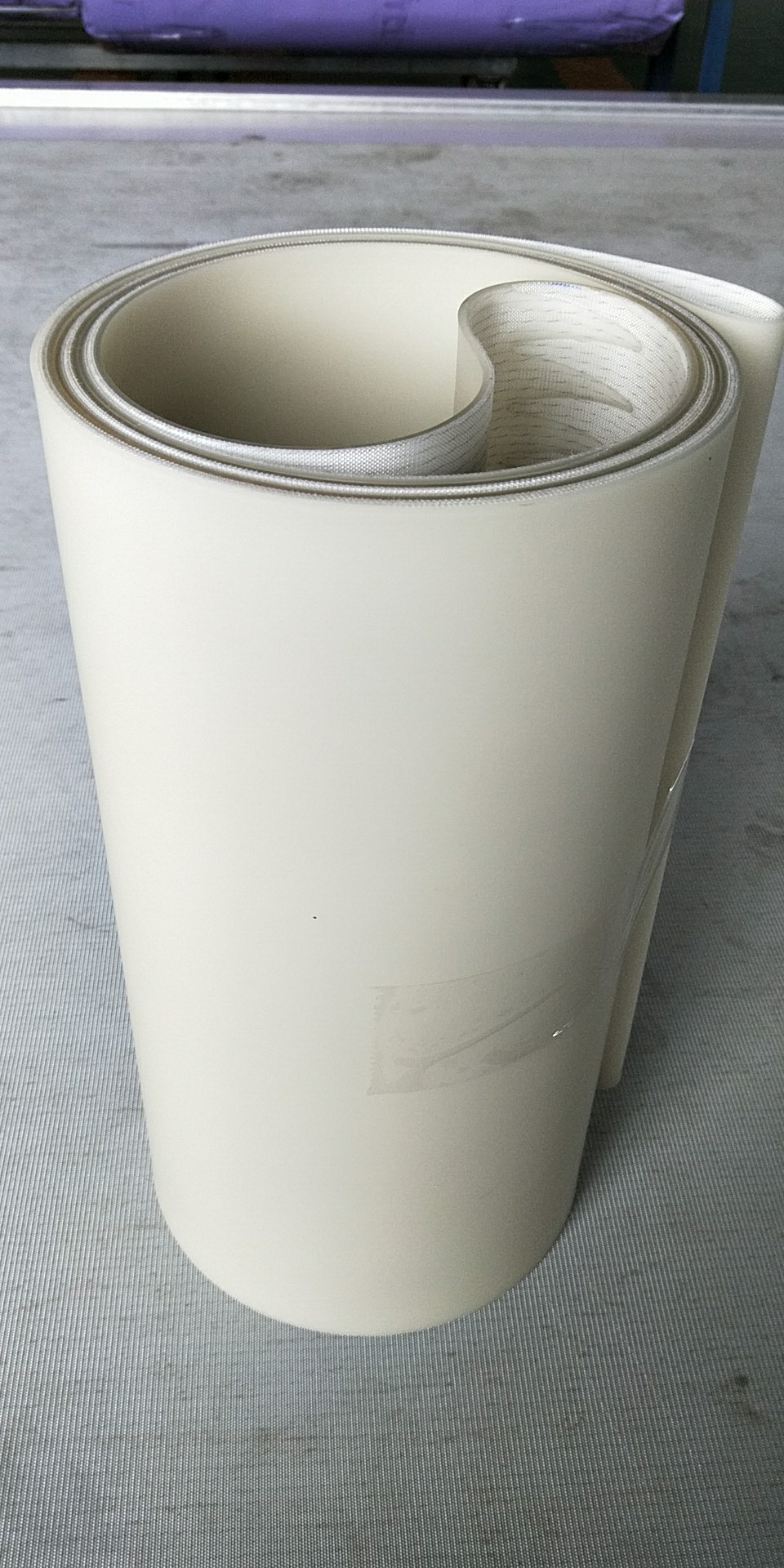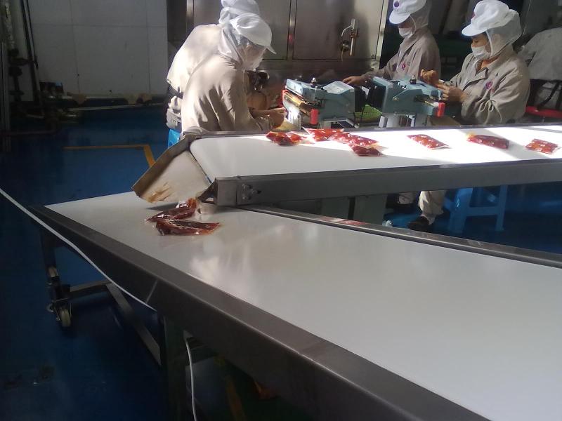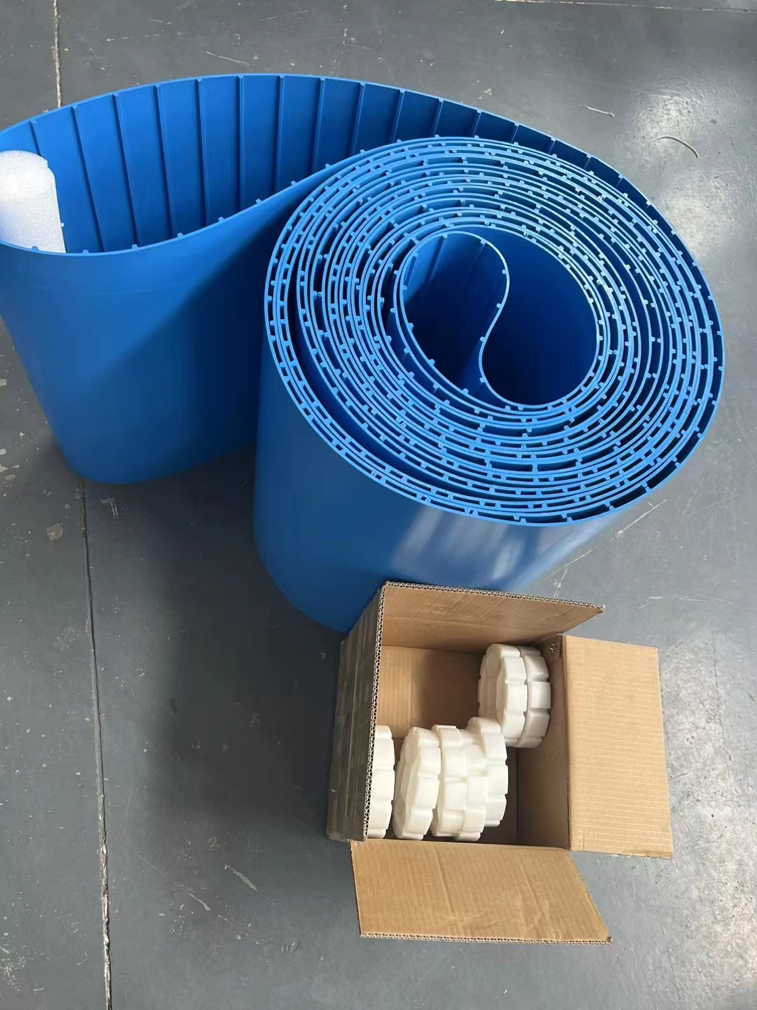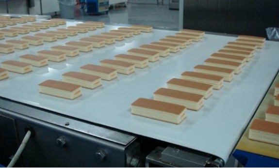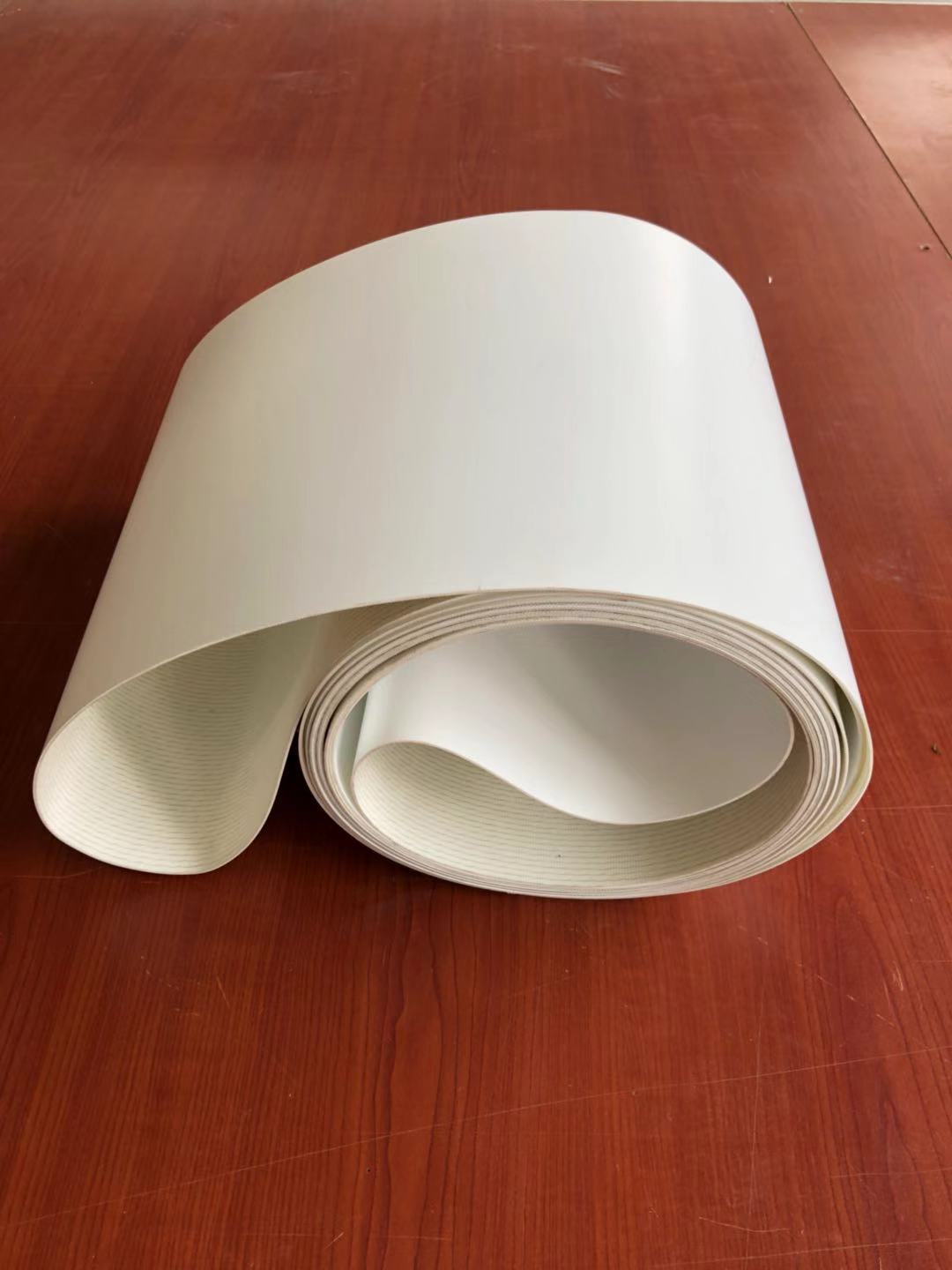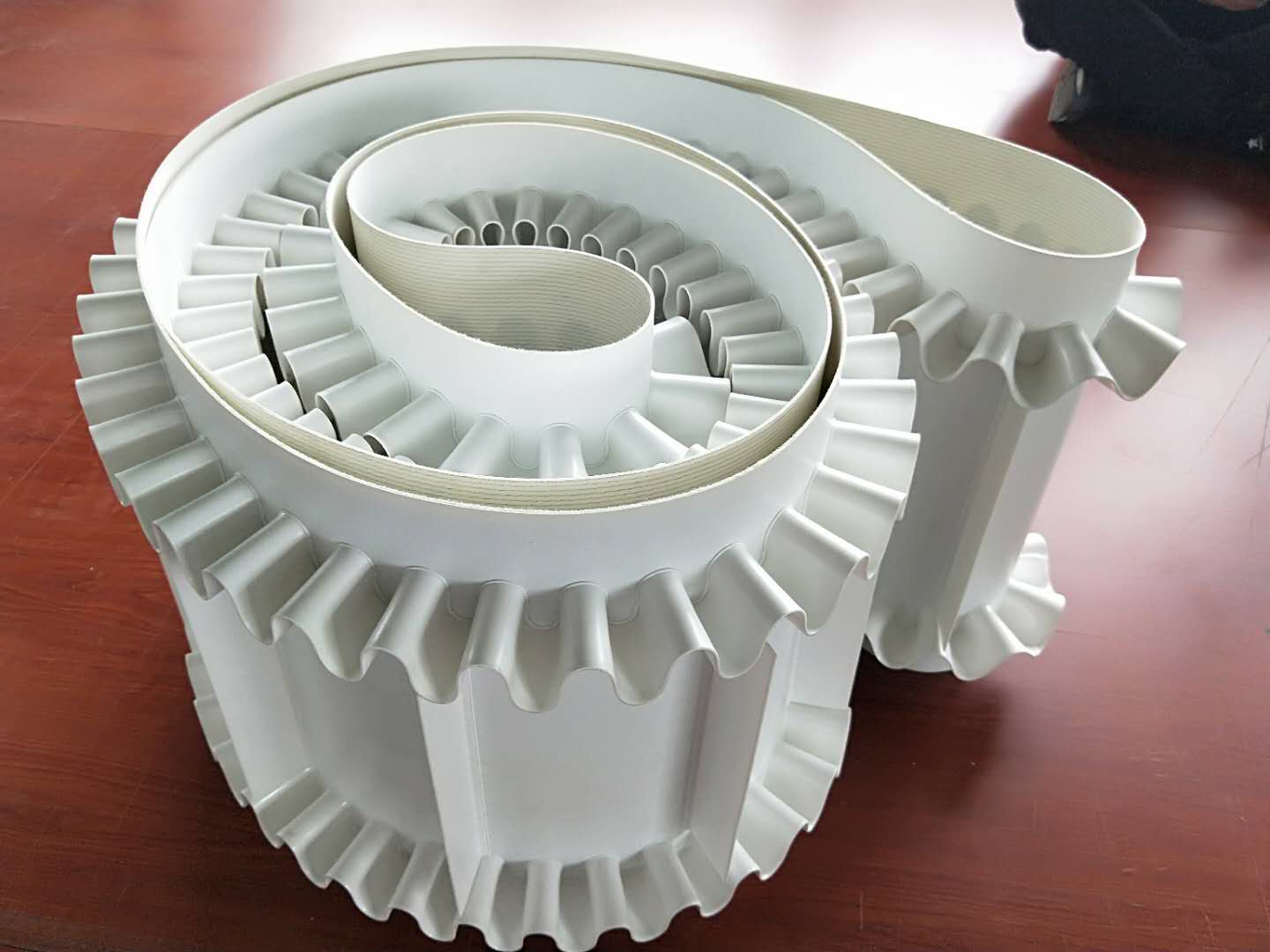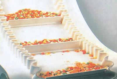 白色食品輸送帶(裙邊擋板帶),擋邊起防止物料測(cè)滑撒落的作用。為便于轉(zhuǎn)彎,裙邊設(shè)計(jì)成波紋狀;橫隔板的作用是承托物料,為了實(shí)現(xiàn)大傾角輸送,采用T型TC型。檔邊和橫隔板是用二次硫化的方法與基帶連接的,具有很高的連接強(qiáng)度。用于輸送易散落的粉狀、粒狀、小塊狀、糊狀及液態(tài)狀物料。